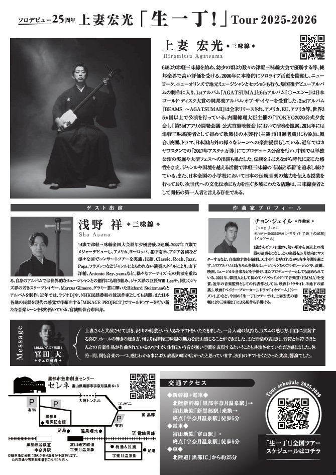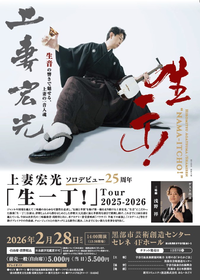 2025.11.20 お知らせ 上妻宏光 ソロデビュー25周年『生一丁!』Tour2025-2026 開催日:2026年2月28日(土) 2026年2月28日(土)開場13:30/開演14:00 黒部市芸術創造センターセレネ4Fホールにて開催 ◎宇奈月温泉旅館協同組合でもチケット販売します。 12月7日(日)~ 受付時間 10:00~15:00 土日祝日販売不可