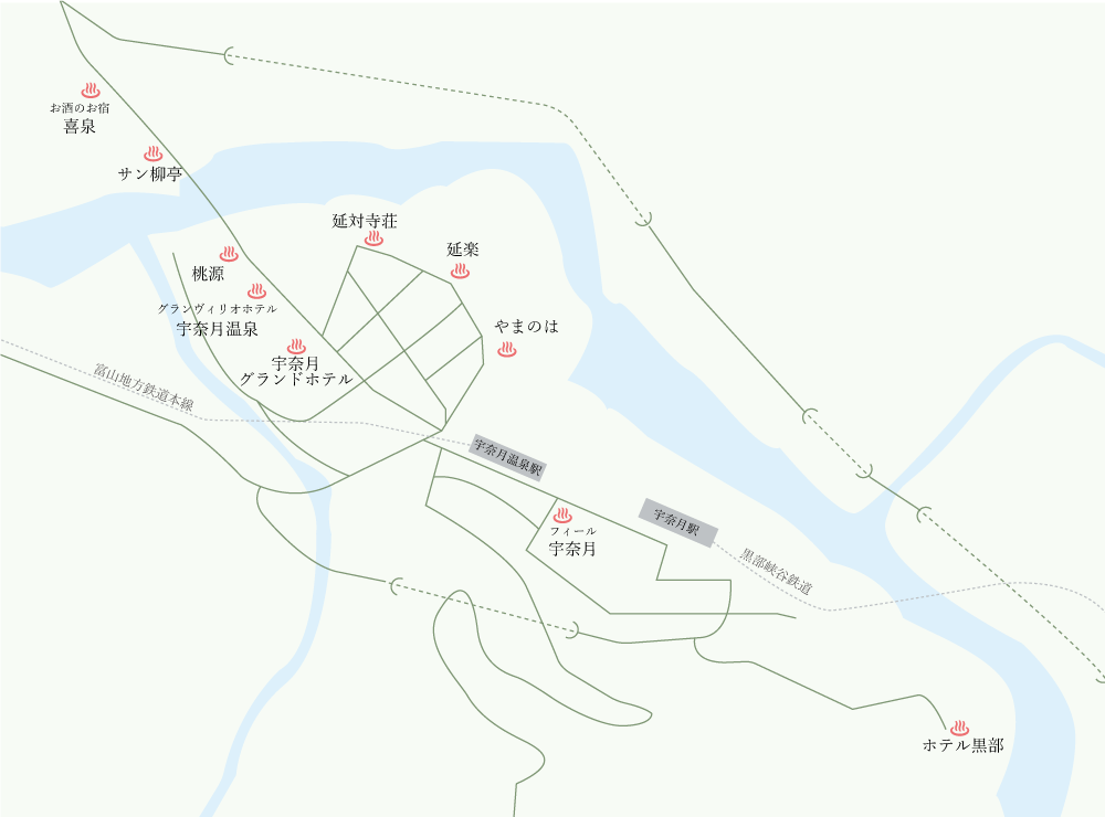 - 雄大な黒部峡谷の自然を臨む湯の町、宇奈月温泉。地元の食材を使用したご当地メニューと日本一の透明度を誇る名湯